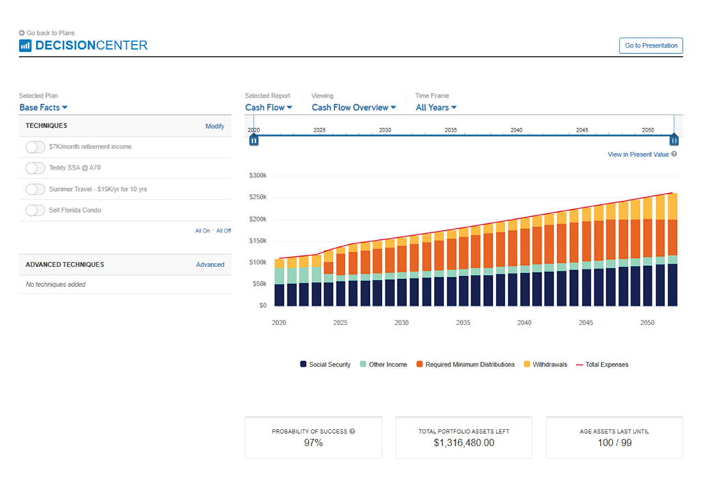 When it comes to the financial planning process, we utilize a tool called eMoney to assist clients in developing a financial plan. A plan includes the collaboration of members of the wealth advisory, fiduciary, and investment teams of First Citizens Wealth Management as well as coordination with outside professionals. By utilizing eMoney, we help clients visualize real-time planning scenarios such as buying or remodeling a home, paying for college, welcoming a new child, paying down debt, or the impact of retirement decisions.