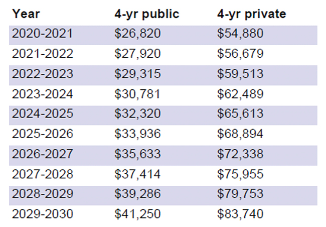 *This chart shows the projected future costs based on average annual college inflation rate of 5%, College Board, Trends in College Pricing and Student Aid 2020.